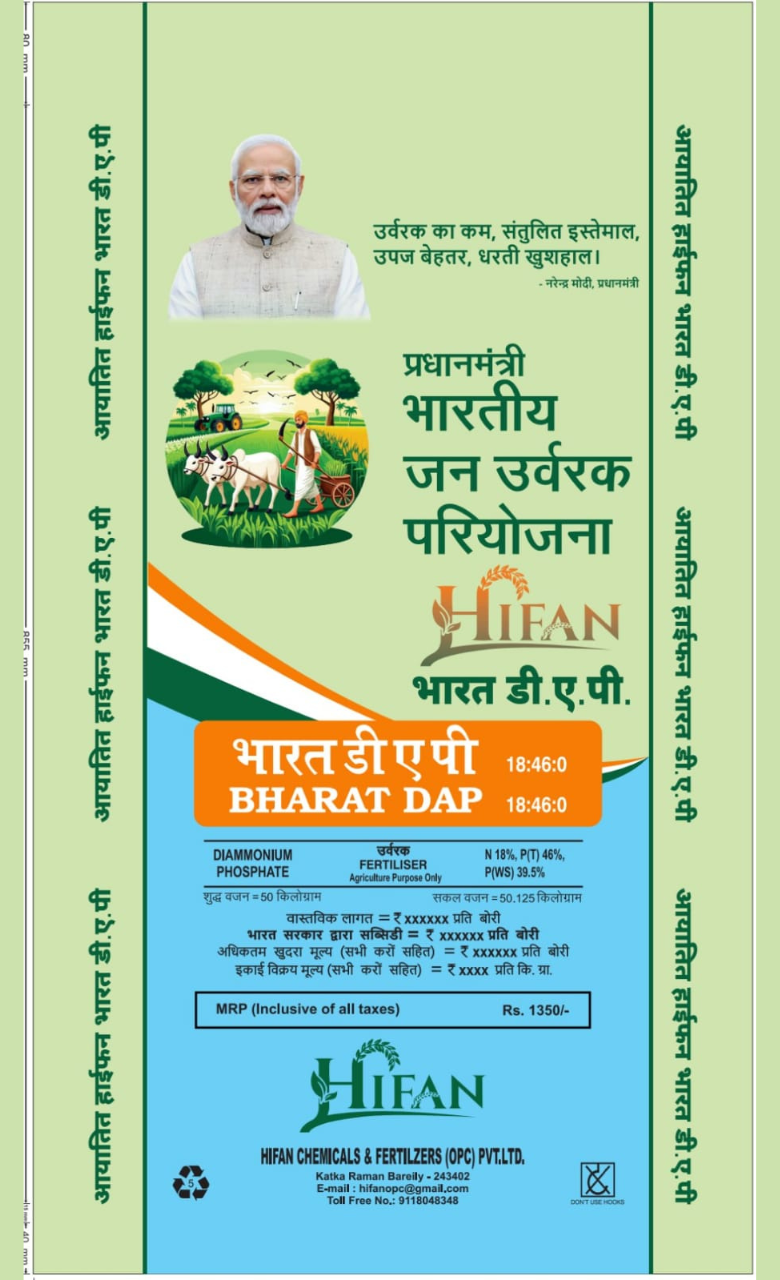 As part of the Pradhanmantri Bhartiya Jan Urvarak Pariyojna, HIFAN proudly presents Bharat DAP (Diammonium Phosphate) – a balanced fertilizer with 18% Nitrogen and 46% Phosphorus.