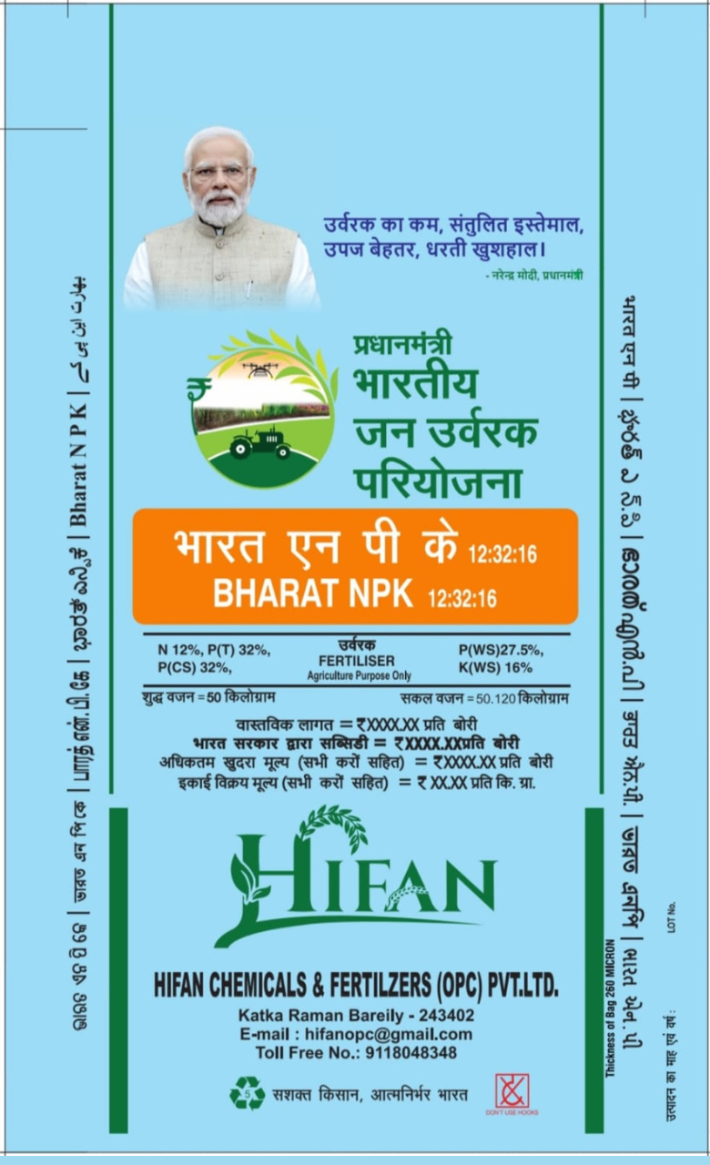 Bharat NPK (12:32:16) is a balanced fertilizer supplied under the Pradhanmantri Bhartiya Jan Urvarak Pariyojna, ensuring farmers have access to quality and affordable plant nutrition.