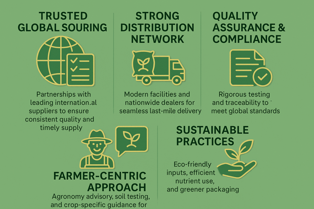 We ensure a reliable supply of fertilizers through global sourcing and efficient logistics. With strict quality checks, traceability, and regulatory compliance, we deliver on time via strong port handling and warehousing. Our farmer-focused approach includes agronomy guidance and soil-test programs, while transparent practices and sustainable solutions promote trust, productivity, and environmental care.